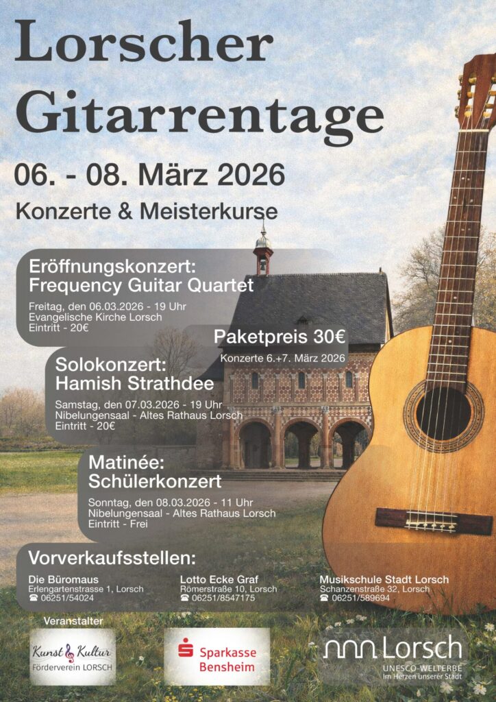 An dem Wochenende vom 6. bis zum 8. März dreht sich alles rund um die Gitarre: Die musikalische Bandbreite reicht von hochprofessionellen Aufführungen vorgetragen von Meistern des Gitarrenspiels bis hin zu Auftritten von Gitarrenstudenten aus Frankfurt und Gitarrenschülern aus Lorsch und Umgebung.